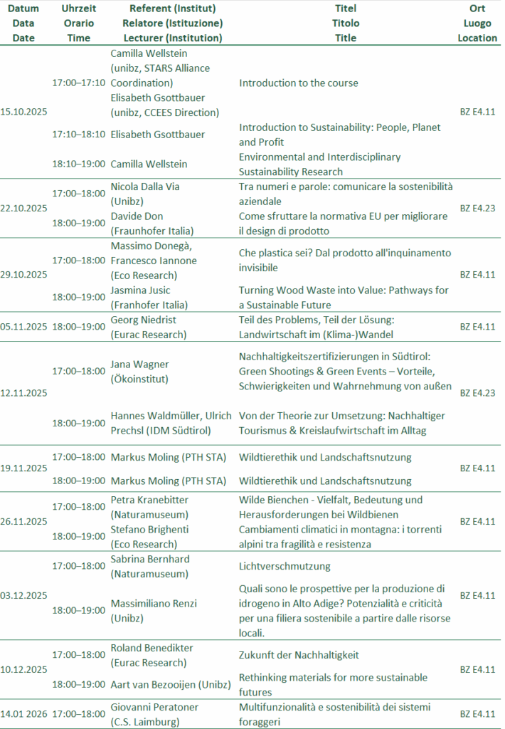The course, coordinated by the unibz Competence Centre for Sustainability (CCEES), involves the participation of 19 lecturers from all the member institutions of the STARS Alliance. Bringing together contributions from multiple disciplines and research backgrounds, it offers a multifaceted and accessible introduction to sustainability, exploring current challenges and possible solutions across the ecological, economic, and social dimensions, with particular attention to the context of mountain regions.
