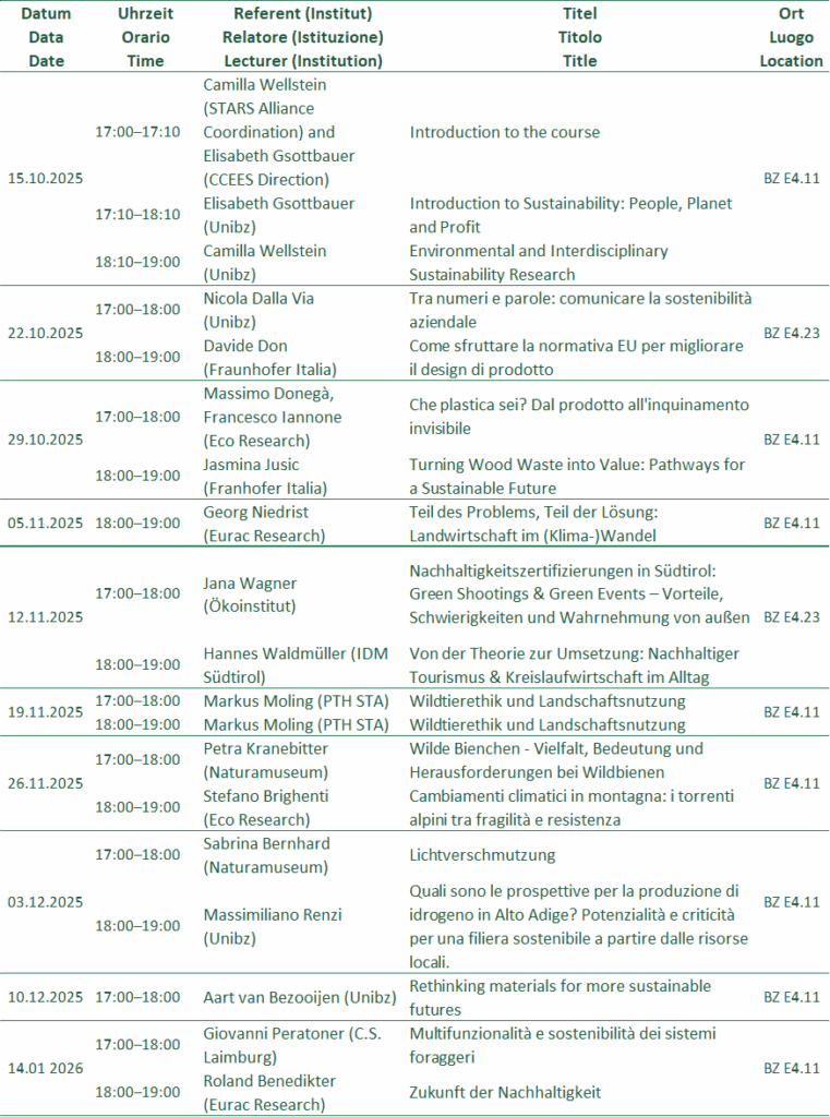 The course, coordinated by the unibz Competence Centre for Sustainability (CCEES), involves the participation of 19 lecturers from all the member institutions of the STARS Alliance. Bringing together contributions from multiple disciplines and research backgrounds, it offers a multifaceted and accessible introduction to sustainability, exploring current challenges and possible solutions across the ecological, economic, and social dimensions, with particular attention to the context of mountain regions.